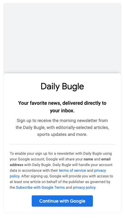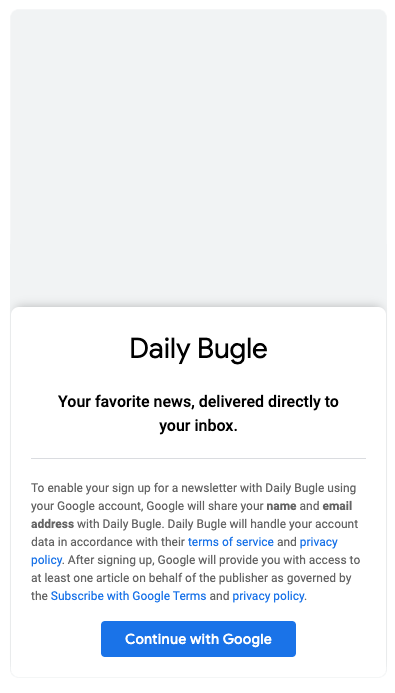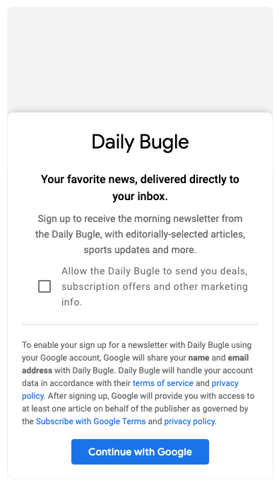 to create the CTA, as well as the newsletter subscriber's information. The configurationId matches the `configurationId provided to the publisher from Google, in response to the per-newsletter configuration authored by the publisher in the initial step.